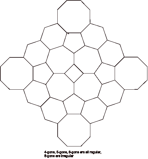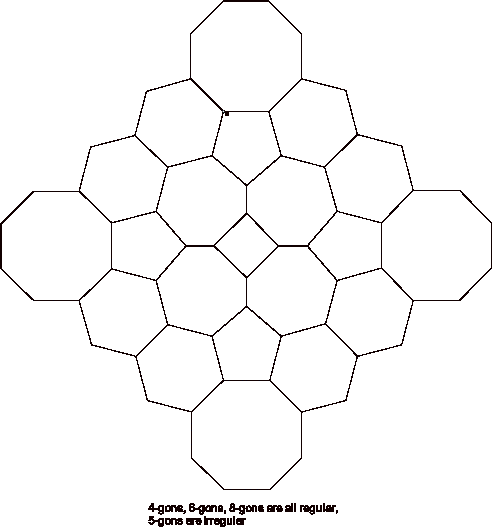 At first blush, this looks like a tessellation using regular 5-gons, 6-gons, 7-gons and 8-gons. However, things are not always what they seem.