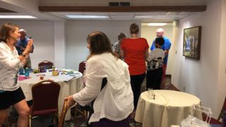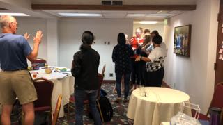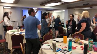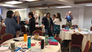 With 25 people in a room, what is the likelihood that 2 will have the same birthday? The math famously (and unintuitively) tells us it's over 50%, so we checked our group and got moving by silently lining up in birthday order. Once participants (slowly) succeeded in getting their order right, we learned that we're a bunch of unique birthday babies. click on each photo to view larger image |