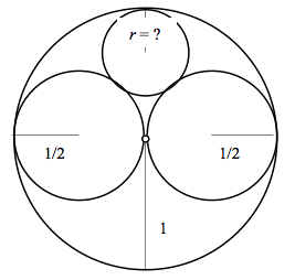 What Is It? Descartes' Circle Theorem involves relationships among radii of tangent circles, "packed" together. The relationship is expressed using the curvature of each circle, which is also the reciprocal of the radius involved. This article contains background and material with problems related to Descartes' Circle Theorem. Grade Level/Strand: The lesson is designed for high school geometry students who have studied tangent circles. Class Time: The lesson is designed to be done outside of class as a directed investigation. Materials: No materials are required but the investigation can be done with the help of The Geometer's Sketchpad®. Prerequisites: Students should be facile with The Geometer's Sketchpad® and should be prepared to solve quadratic equations. Introduction: Mathematics is not so established that there is nothing new to be learned, especially from high school geometry. While at a conference in 1998, Allan Wilks, a statistician at AT&T Laboratories in New Jersey, had a conversation with a colleague who had been pondering his daughter's homework assignment. The question concerned a pattern made up of a large circle (of radius 1) tangent to two congruent, "kissing" (tangent) circles (of radius _) that fit inside it. The problem was to find the radius (r) of the smallest circle tangent to all three existing circles as in Figure 1. Figure 1. Nested tangent circles