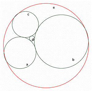 As in both Figures 1 and 3 with one circle enclosing other circles, an adaptation of the definition of curvature has to be adopted for the Circle Equation to hold. That is, the quadratic equation holds if the curvature of the enclosing circle is negative (curvature of the larger circle = -1 in Figures 1 and 3). In lay terms, if all the points of tangency are external, the curvatures are considered positive, but if one circle encompasses the others, that circle has negative curvature. In Figure 3, curvatures a, b, c, and d have positive curvature while curvature e is negative. Applying Descartes' Circle Theorem in Figure 3 with curvatures, a, b, c, d, and e, the curvatures d and e are the positive and negative roots of the following quadratic polynomial in x: (a2 + b2 + c2 + x2) = (1/2)(a + b + c + x)2. To show this, consider that Descartes' Theorem applies to both circles with curvatures d and e since both are tangent to a, b, c. There is nothing in the theorem about being tangent inside or outside, except for the sign convention. Wilks realized because the Root Sum Theorem for quadratics states that the roots r and s of polynomial have product c and sum -b, and because if b is an integer and one of the roots is an integer, then the other root must also be an integer. Thus, if the curvatures of the four initial circles are integers, the other root e is an integer. Furthermore, if additional tangent circles are constructed to fill in the holes in such a figure, the curvature of every subsequent tangent circle is also an integer. Other people have been fascinated by and used the Descartes Circle Equation. Nobel Prize winning Chemist Frederick Soddy (1936) wrote "The Kiss Precise" about Descartes' Circle Equation with a middle verse as follows: Four circles to the kissing come, A connection to Wilks' contemplation and Descartes' Circle Equation arose at the Park City Mathematics Institute 2002. Jeff Lagarias, a mathematical researcher at AT&T, introduced me to the topic of packing circles in an informal lunch conversation when I told him of my fascination with the morning theoretical mathematics sessions using Gaussian integers (complex numbers in the form a + bi where a and b are integers). Jeff showed me the original circle-packing problem but went a step farther to show me a connection to Gaussian integers. He related that a Gaussian integer is produced for every circle when its center (in a complex plane) and its curvature are multiplied. While this Gaussian integer connection is intriguing, most high school students are not ready for that connection. However, to get them to begin thinking about tangent circles, the following worksheets focus only on curvature and Descartes' Circle Equation while their teachers are encouraged to explore the Gaussian connection (see the Wilks reference below). References: Further information on Wilks' findings, curvature and Gaussian integers can be found at http://www.sciencenews.org/20010421/bob18.asp Peterson, I. 2001. Circle Game. Science News Online (April 21). Available at http://www.sciencenews.org/20010421/bob18.asp Soddy, F. 1936. "The Kiss Precise," Nature (137), 1021. Sykes, M. 1912. Sourcebook of Problems for Geometry. Palo Alto, CA: Dale Seymour Publications. ANSWERS TO QUESTIONS